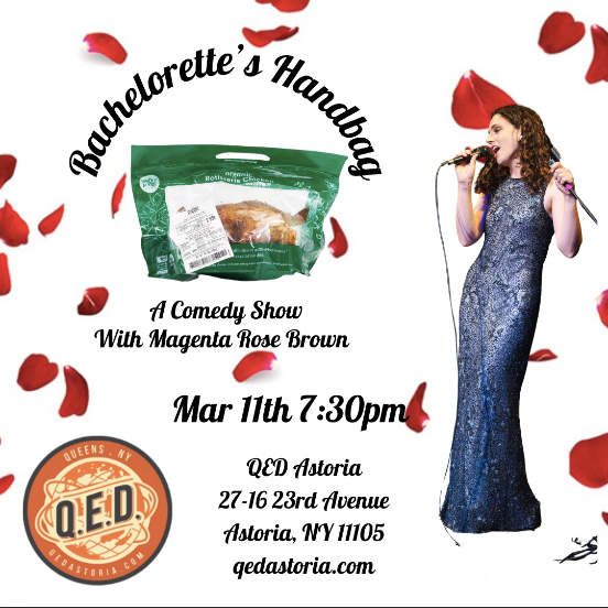 Bachelorette's Handbag is a comedy competition show where you choose the winner, who takes home not only the final rose, but also a "bachelor's handbag," more commonly known as a grocery store bagged rotisserie chicken. Featuring stand-up, improv, and a talent show, Bachelorette's Handbag is promised to be a night of love, laughter, and protein. You won't want to miss the hottest new show with slightly chilled poultry.