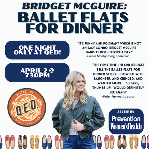 Using A mix of stand-up and storytelling, “Ballet Flats for dinner” tells the story of McGuire's life growing up with intrusive thoughts with harm, a form of OCD. From thinking she was pregnant at age 11, to wondering if she killed her friend's boyfriend at 25, to finally getting help at the ripe old age of 38, Ballet Flats will have you laughing the entire time and perhaps you'll walk away wondering, "Do I have OCD too?" (Don't worry, you probably don't).
