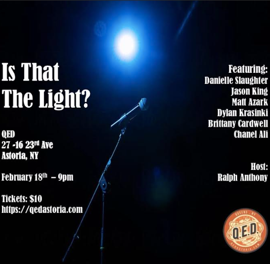“Is that the Light,” is a New York City based live stand up comedy show produced in the heart of Astoria at QED. It’s hosted by Ralph Anthony, and features some of the top comedians from all over the country. They’ve been featured on the late night TV, Netflix, Amazon Prime, the NY Comedy Festival, and JFL to name a few. Audiences will be in for a fun time and guaranteed laughs so come out and enjoy the show.